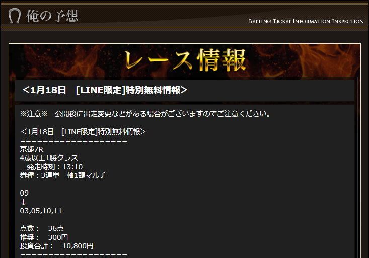 めちゃめちゃ当たってるイメージのオールウィンまずは無料情報から試してみました。 ここは他の競馬予想サイトとは違い、平場レースだすんだ?って印象、この日は京都4R無料予想。 3連複6-8-9的中(5,180円)馬券代が3,600円が10,360円と約3倍!! 美味しいですねこういう予想、複数無料予想出してくれたのに単日5~6万稼げそうですが無料は1鞍だけかな? 満足いく結果でした。