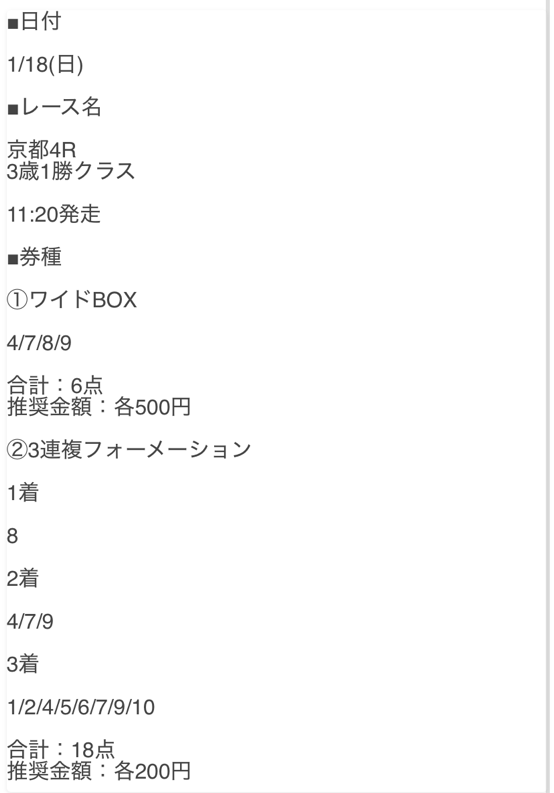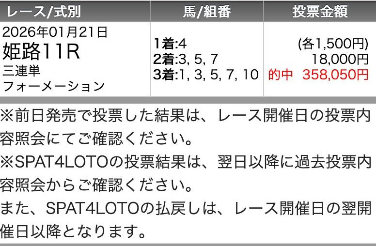 1月の重賞は毎年、金杯からずっと荒れますね、競馬場ではゴール後に悲鳴でしょうが私は歓喜でした。 軸は前評判人気馬だったから個人の予想で買えても、2着、3着と11人気、9人気は絶対に拾えていなかったです。 気持ち的にはもっとオッズ上ってほしかったけど、50万9500円払い戻しは1月から上々のスタートです。 競馬予想サイト使うからにはこれくらいを毎回貰いたいところですね。