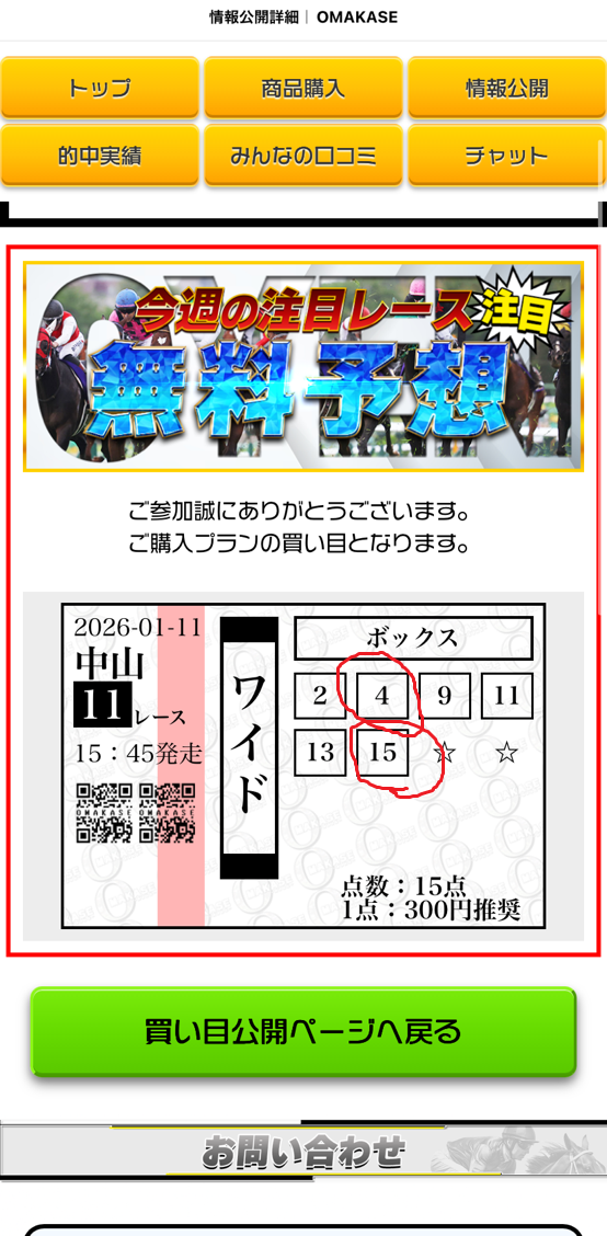 運営さんも人間だから間違える事はあると思う。 ワイド5頭だと15点じゃなくて10点ですよ(笑) 点数は間違えてるけど買い目はドンピシャ! 2026年を占う中山金杯、その無料予想で 1着~3着ドンピシャ! これなら3連単456倍も付いたから買っておけばよかった 来週はフェアリーステークス出すみたいだから重賞的中頼んだ! 次は3連単も買う!